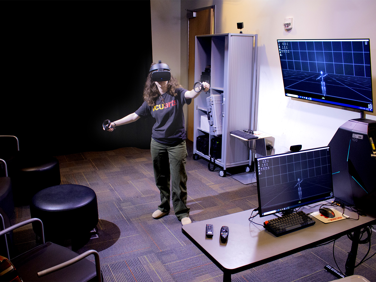 Play, create or edit 2D, virtual and mixed reality games, environments and content; create advanced multimedia projects with 4K camera, adjustable lighting, and sound system; learn 3D scanning and photogrammetry. Attend an orientation to become an authorized user and reserve the XRAM Studio in advance. The room holds up to 8 people.